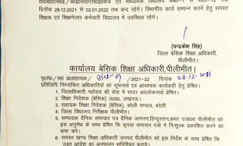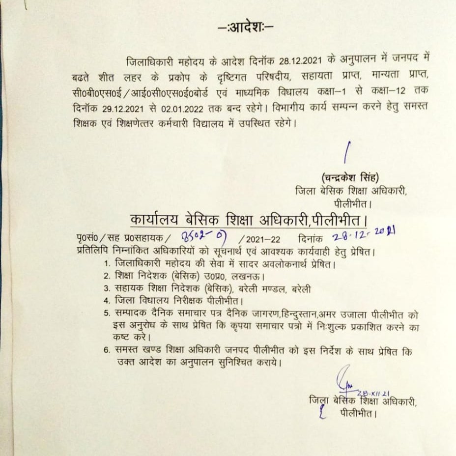 पीलीभीत। हल्की बूंदाबांदी के बाद शीतलहर बढ़ने से जिला प्रशासन ने 29 दिसंबर 2021 से 2 जनवरी 2022 तक का कक्षा एक से कक्षा 12 तक के स्कूलों में अवकाश घोषित कर दिया है। इसका आदेश बीएसए चंद्रकेश सिंह ने जारी किया। देखिए आदेश-