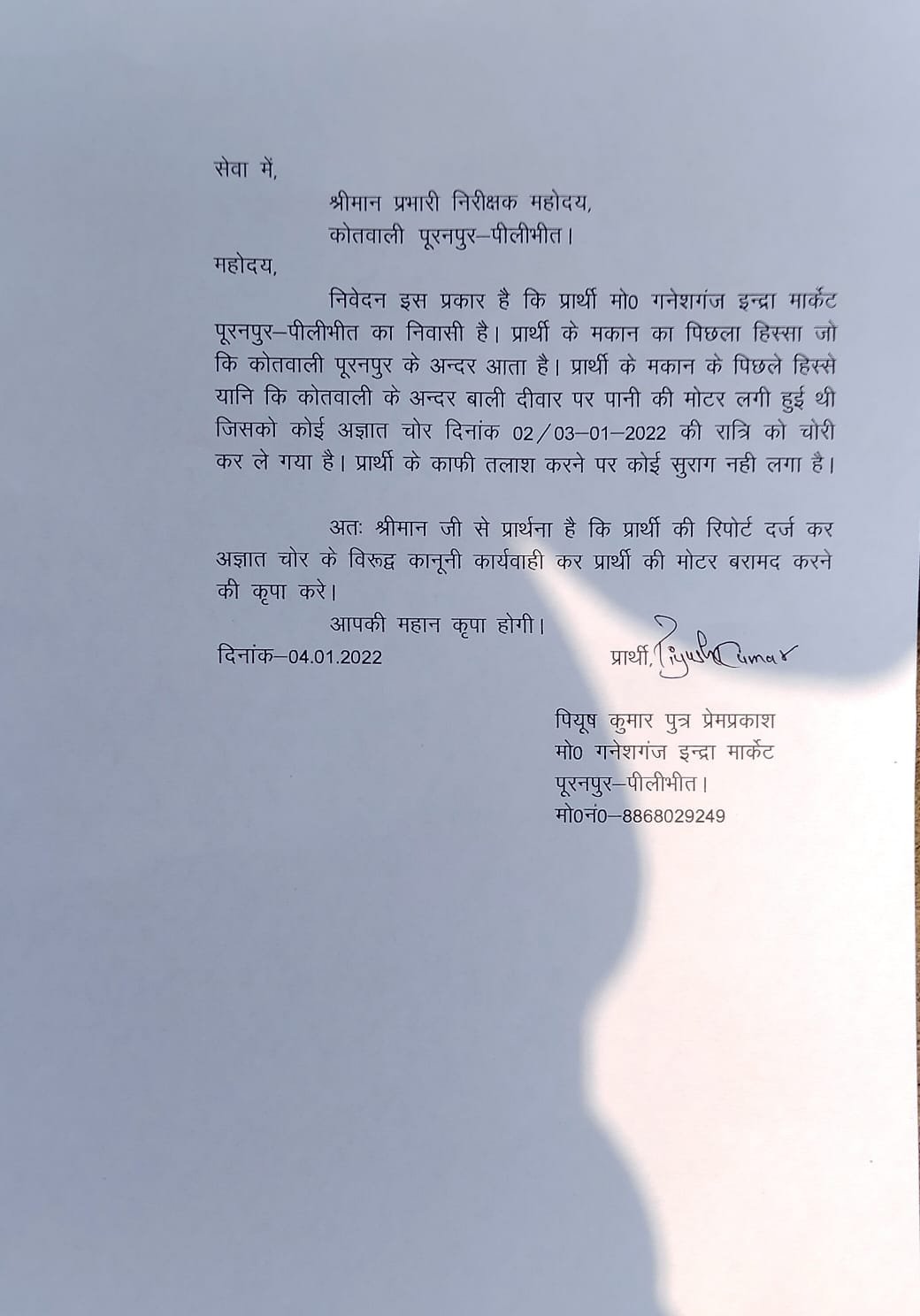 पूरनपुर। चोरों में पुलिस का इकबाल बिल्कुल समाप्त हो गया है। अब चोर कोतवाली के अंदर घुस कर भी चोरी करने लगे हैं। बीती रात कोतवाली तरफ से आकर चोरों ने पीयूष का टिल्लू पम्प चोरी कर लिया। इसकी तहरीर पुलिस को दी गई है। देखें तहरीर-