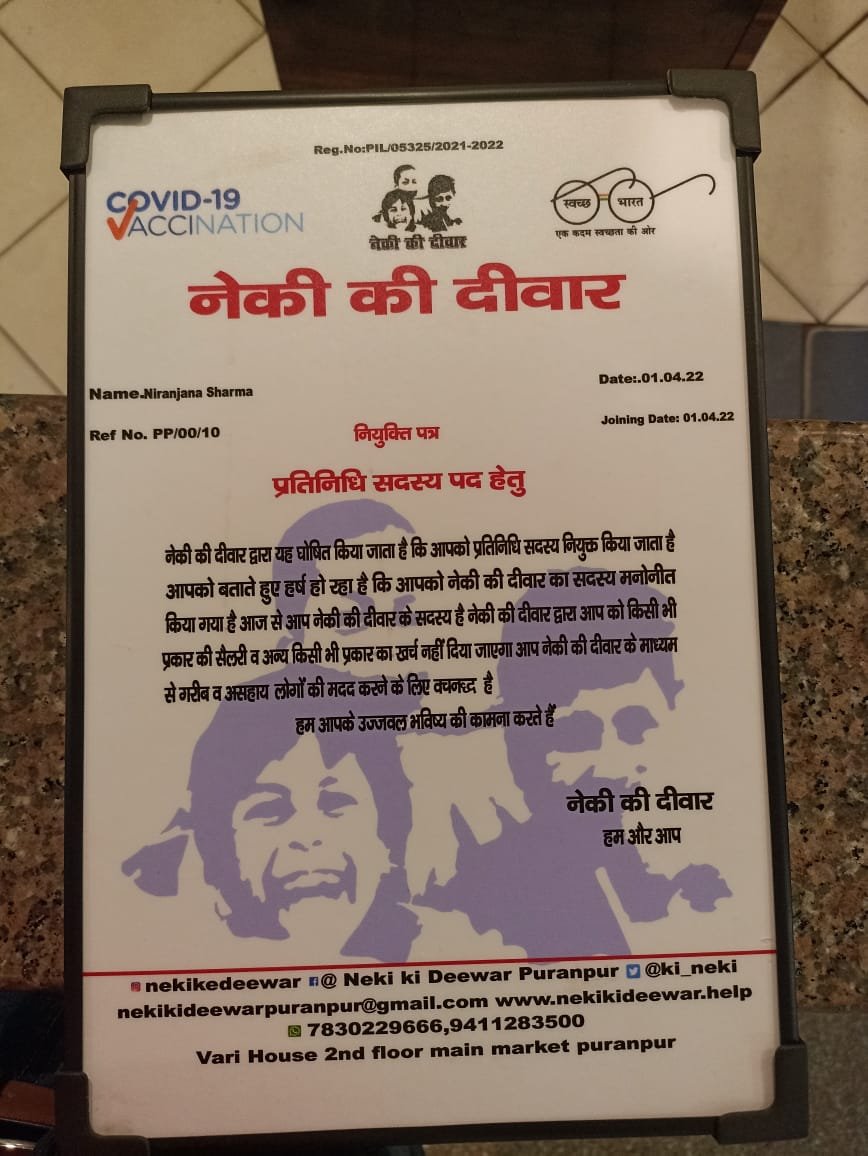 समाज के जरूरतमंद लोगों के साथ संस्था हमेशा तत्पर तैयार हैं। गत दिनों पूरनपुर पहुंची पत्रकार प्रज्ञा मिश्रा ने भी नेकी की दीवार व संस्थापक गुरमेल सिंह की प्रशंसा की थी।
